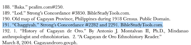 Really the question why a place without rivers is named Cagayan is a red herring Tim us using to distract the reader and listener. Here are some questions for him: Why is there no place called Cagayan in Israel if it is indeed a Hebrew phrase proper for a place name? Why do the two words "Chaga" and "yan" or "yah" never appear together in the scriptures? In his sourcebook Tim links the word "Yan" to Strong's H2605.
